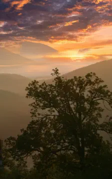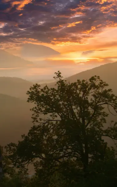 steil aufragenden Sindelsberg. Nebelschwaden verschleiern die bunt